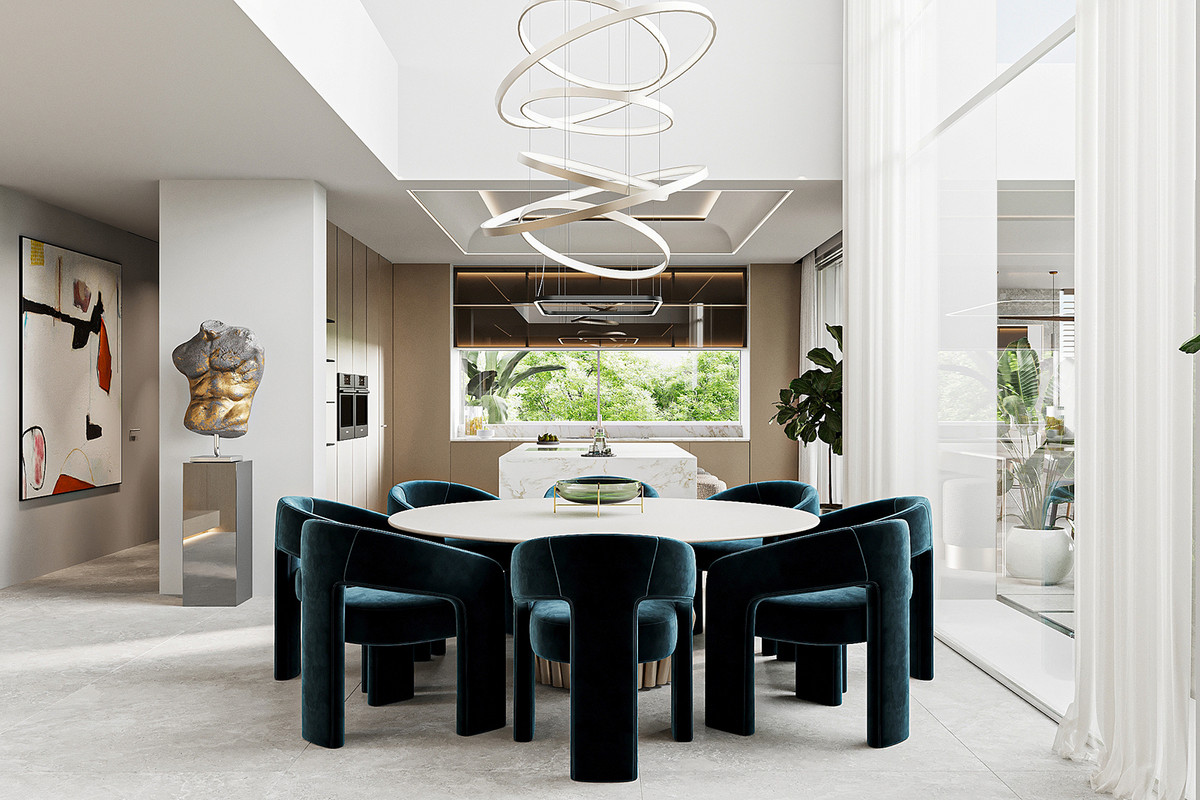 A majestic entrance with a water feature welcomes you into this wonderful property. The large windows bring in abundant natural light throughout the villa and create a seamless connection between the indoors and the surrounding nature.
