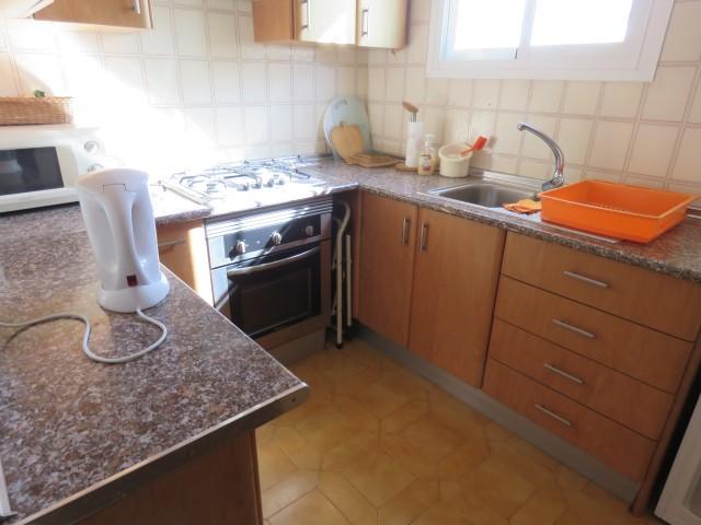 Une cuisine entièrement équipée avec espace de rangement