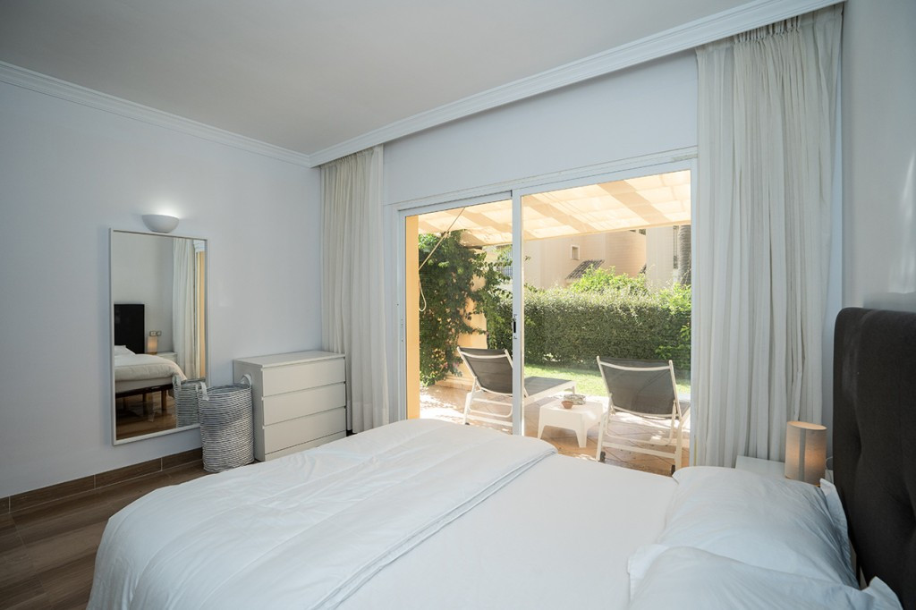 This beautifully refurbished apartment is nestled in one of Elviria's most sought-after complexes in East Marbella, offering the perfect blend of luxury and convenience. Just a short stroll from the beach and vibrant local amenities, this original two bedroom property has been converted to offer three spacious bedrooms and two modern bathrooms. The master bedroom features an elegant en-suite bathroom, while a second bathroom serves the remaining rooms. The heart of the apartment is its brand-new open-plan kitchen, seamlessly flowing into a bright living area. From here, step out onto the expansive covered terrace that leads to your own private garden – ideal for al fresco dining or relaxing in serene surroundings.