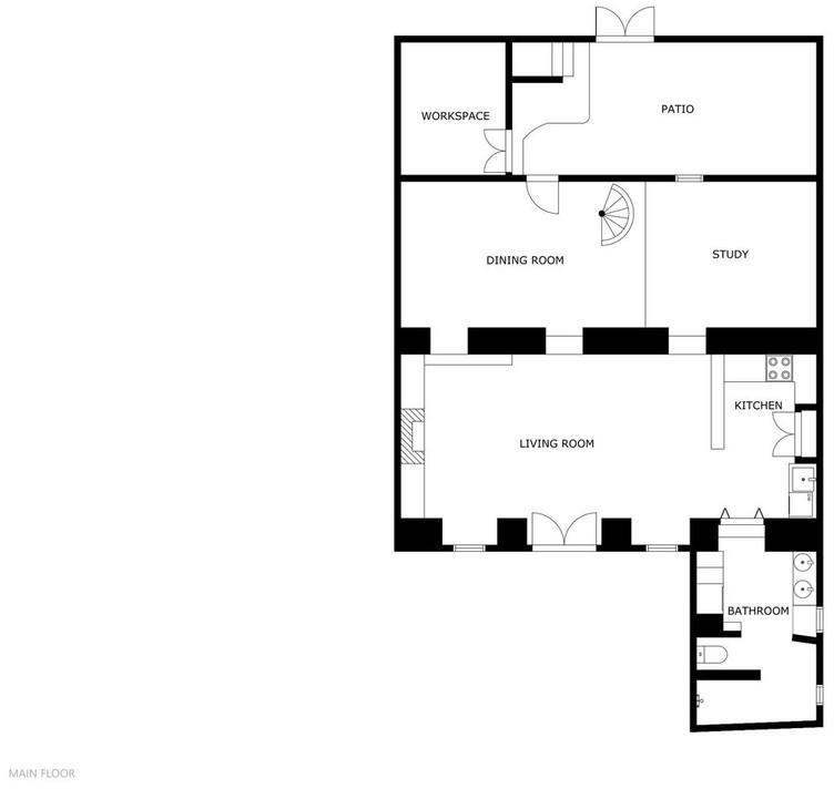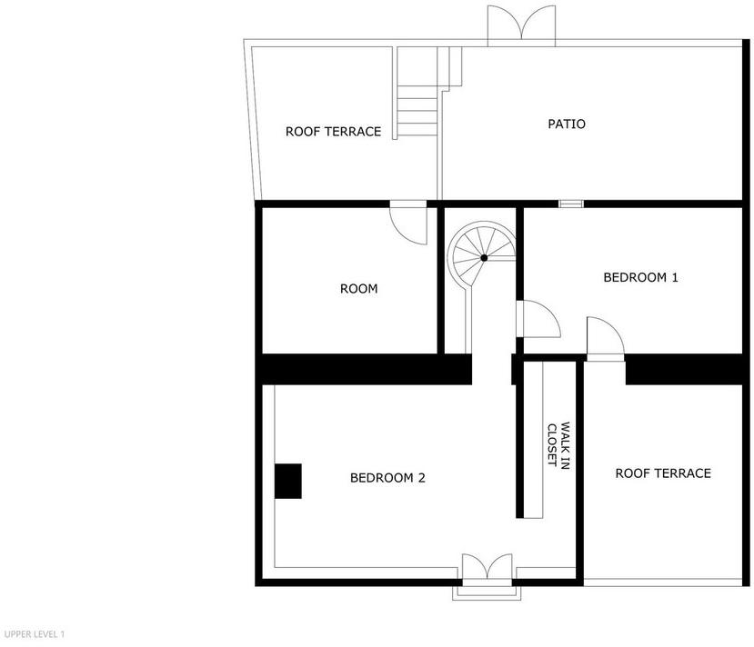 An open passage leads to the dining area under an impressive five-meter-high ceiling. From here there is access to the patio and a separate office, which can also serve as an additional bedroom. A striking spiral staircase takes you upstairs, where two spacious bedrooms await. The master bedroom includes a walk-in closet and a French balcony, while the second bedroom is light, airy, and has direct access to a large terrace with beautiful views.