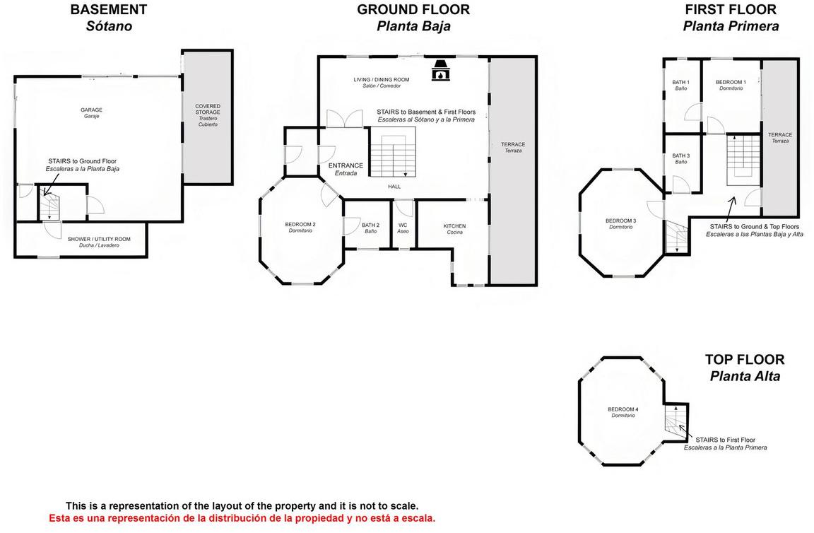 The main floor is bright and inviting, with a spacious living room-diner featuring a cosy fireplace. From here, doors lead directly onto a fabulous terrace that overlooks the pool and gardens, an ideal setting for al fresco dining or simply relaxing in the sun. The fully fitted modern kitchen is both stylish and practical, while this floor also includes a guest WC and a comfortable bedroom with its own ensuite bathroom, perfect for visitors or family members who prefer single-level living.