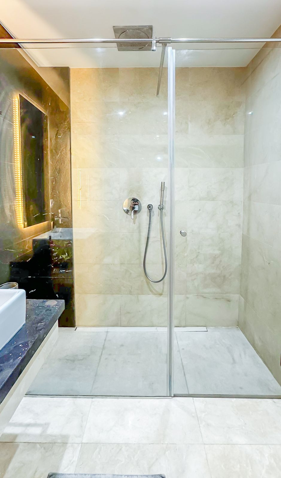 The open-plan living and dining room opens completely through floor-to-ceiling glass doors, creating a seamless connection with the spacious terrace, covered porch and private garden. The design gives you the feeling of living in a villa while enjoying all the convenience of a luxury apartment.