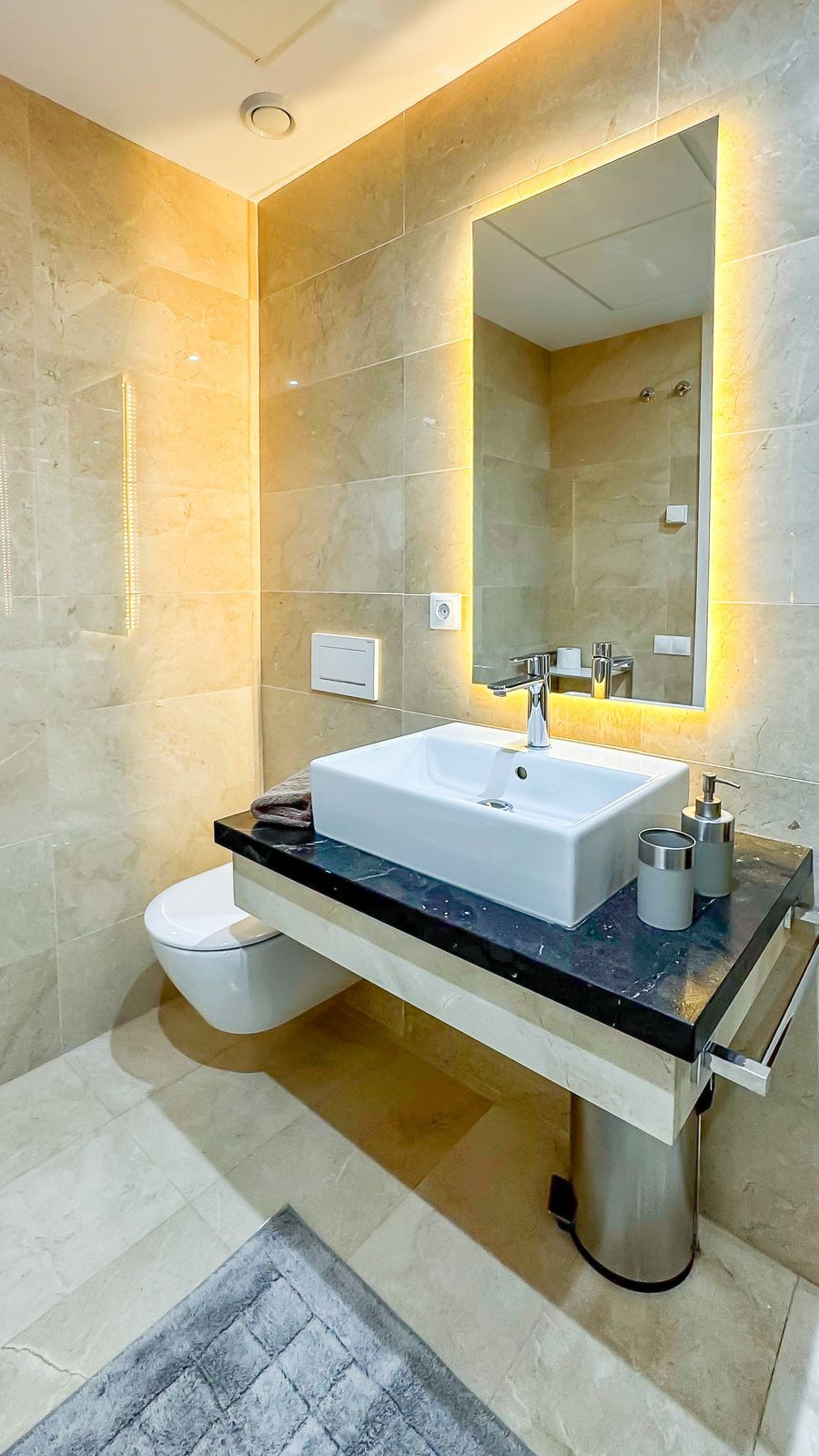 Inside, both bathrooms are finished to a high standard with underfloor heating, while the kitchen comes fully fitted with top-quality appliances. The apartment is full of thoughtful details: electric blinds, premium wood and stone finishes, and carefully chosen wall materials that enhance both comfort and acoustics. A separate utility room adds extra practicality.