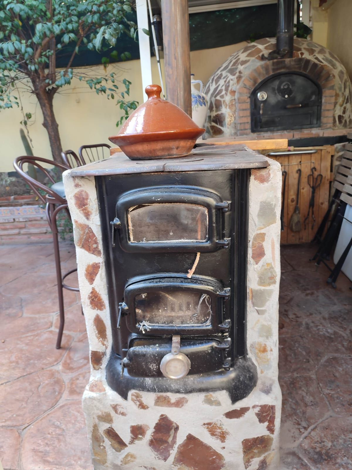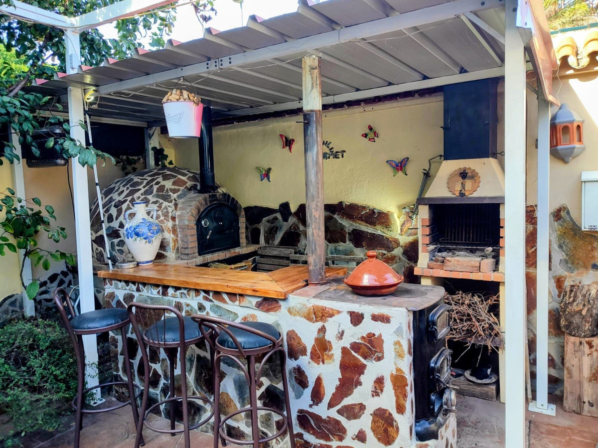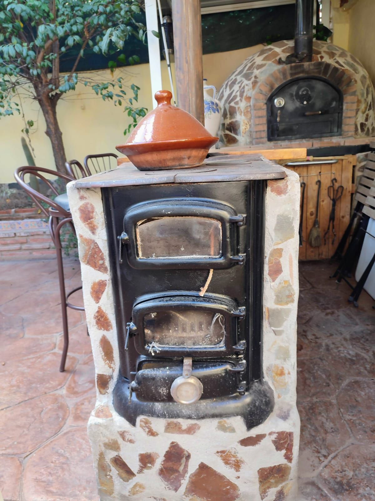 The property boasts an artisan-built wood oven, a charcoal and wood stove ideal for slow cooking, a barbecue, and a bar area ready for a bottle fridge and stools — perfect for gatherings.