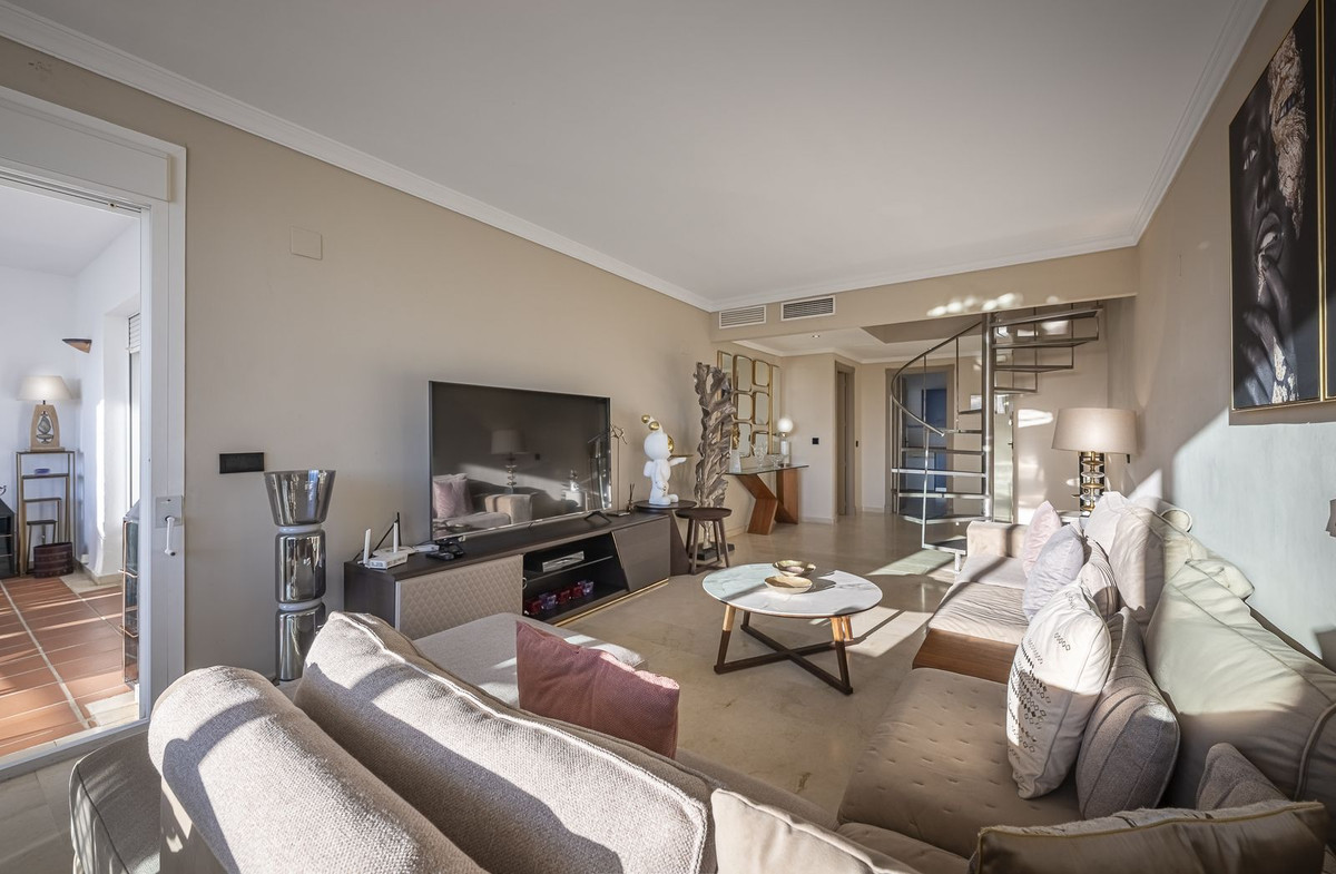 Welcome to Marbella.Imagine waking up every morning with the gentle Mediterranean breeze caressing your face and the promise of a new day in one of the most exclusive enclaves in the world.This luxurious duplex, located in the vibrant heart of Puerto Banús, is not just a property: it is a haven of elegance, serenity and style.From the moment you step inside, you will be dazzled by the exquisite décor, where every detail has been carefully chosen to create a unique visual and sensory experience.The spacious and bright rooms open naturally to the outside, allowing the southern light to flood every corner.On the main floor, the fully equipped separate kitchen is an ideal space for both enjoying fine dining and sharing special moments.Adjacent to it, the living room offers an atmosphere of absolute comfort, perfect for relaxing after a day enjoying the charms of Marbella.On this same level, two bedrooms guarantee rest and privacy:• A master suite with a king-size bed, private bathroom and a cosy glazed balcony where silence and calm reign supreme.• A second bedroom with two single beds and a full bathroom, designed for the comfort of family or guests.Climbing the elegant staircase, you discover the true treasure of the property:a spacious master suite with direct access to the upper terrace.From there, the sea views are a changing spectacle that accompanies every sunrise and every sunset.