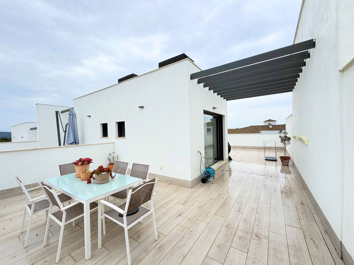 On the upper floor, the master bedroom stands out with its en-suite bathroom and a glazed balcony. The other two bright bedrooms feature built-in wardrobes, share a full bathroom, and have access to a second balcony overlooking the community entrance. On the top level, the solarium offers a spectacular setting: a spacious, open area with panoramic views of the sea, golf, and natural surroundings, perfect for a chill-out zone, a barbecue area, or simply enjoying the sun and privacy. Two parking spaces, electric blinds, high-quality finishes, and the option to convert the current study into a fourth bedroom complete a home designed for uncompromised living.
