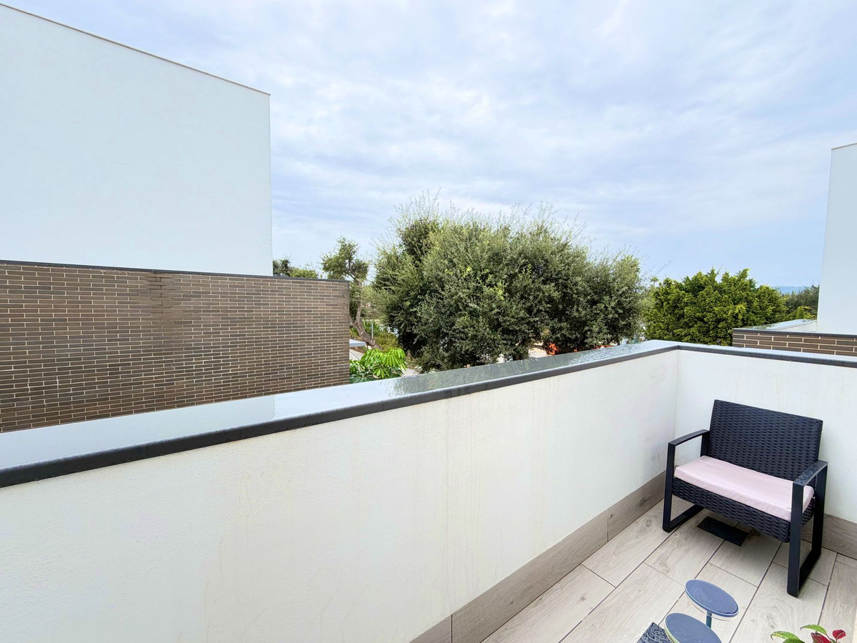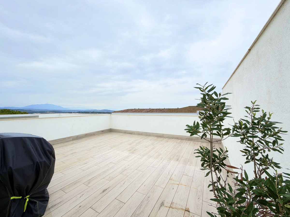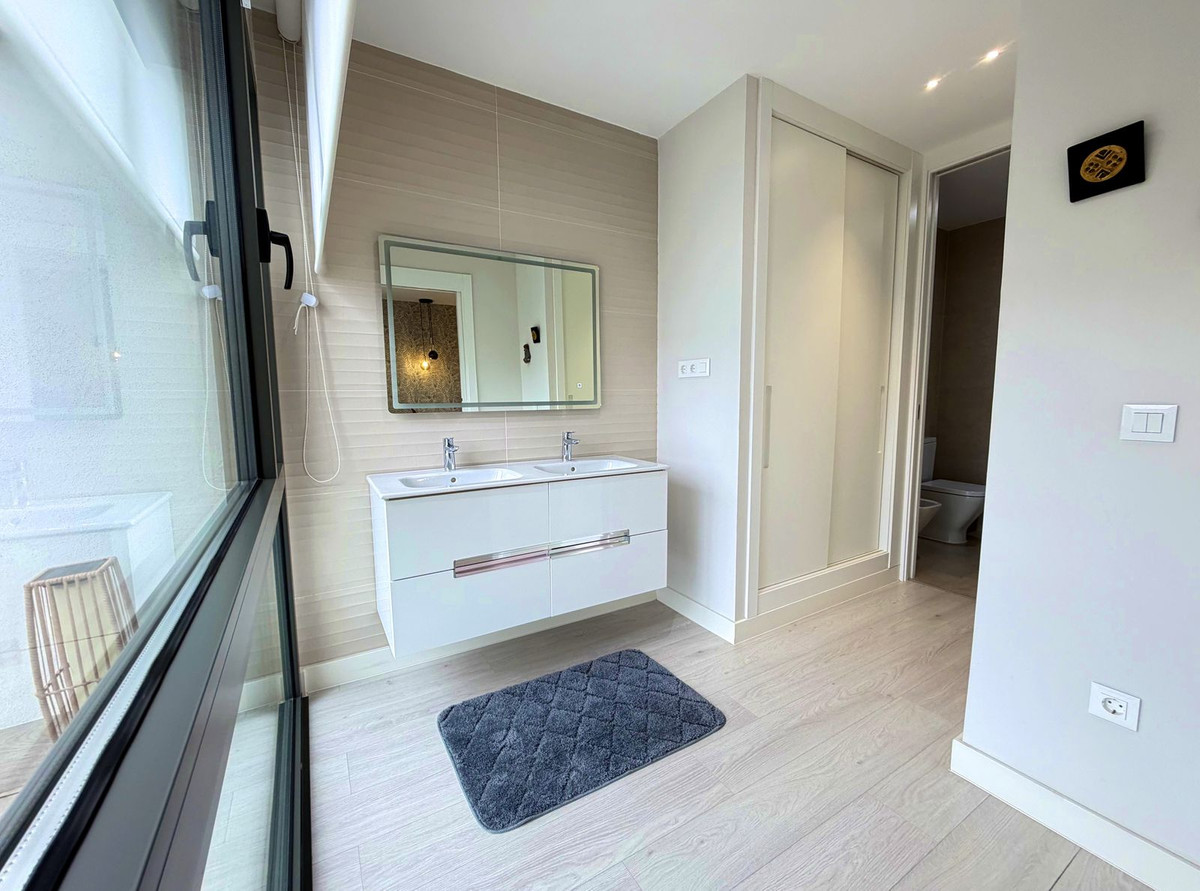 This beautiful, bright, modern townhouse, completed in 2022, offers approximately 238 m² of intelligently and harmoniously distributed living space, creating wide, welcoming rooms full of natural light. Facing southeast, it enjoys spectacular sunrise views over the sea, golf course, mountains, and the impeccably landscaped community gardens. The spacious, modern living room opens onto a large terrace and a private garden with an inviting pool. The contemporary kitchen with a utility area, equipped with high-end appliances, seamlessly integrates with the main living space, combining elegance with functionality. A guest toilet completes this level.