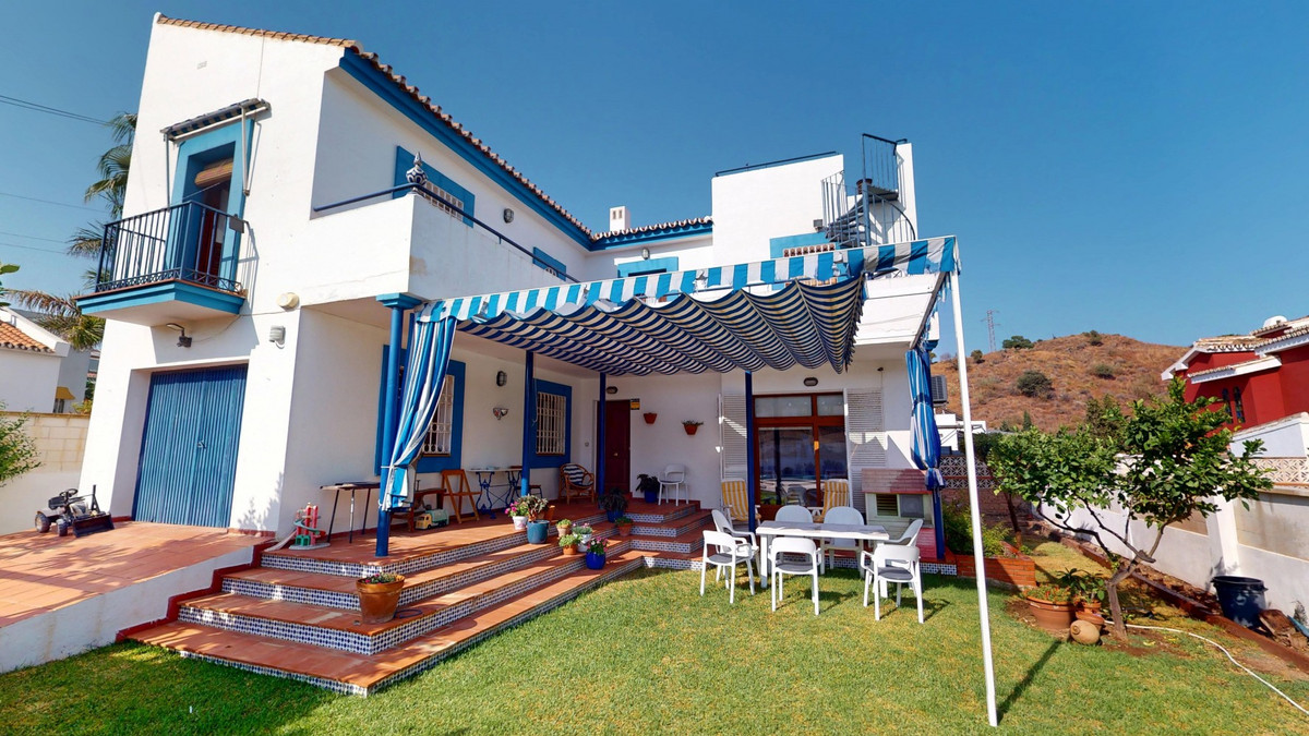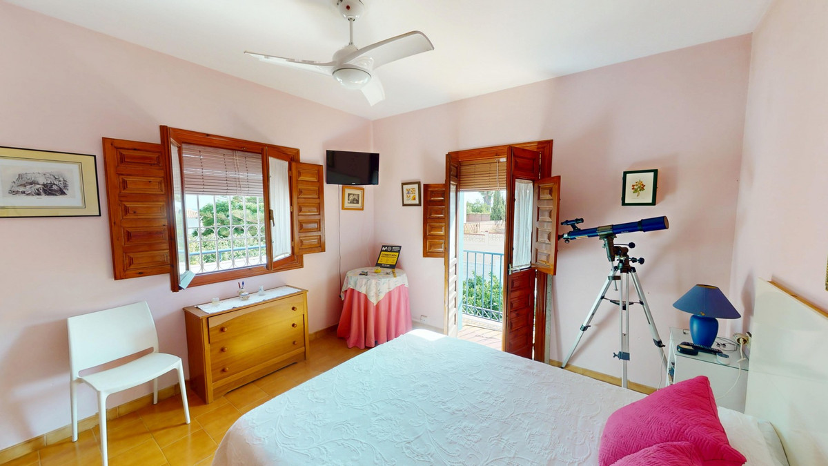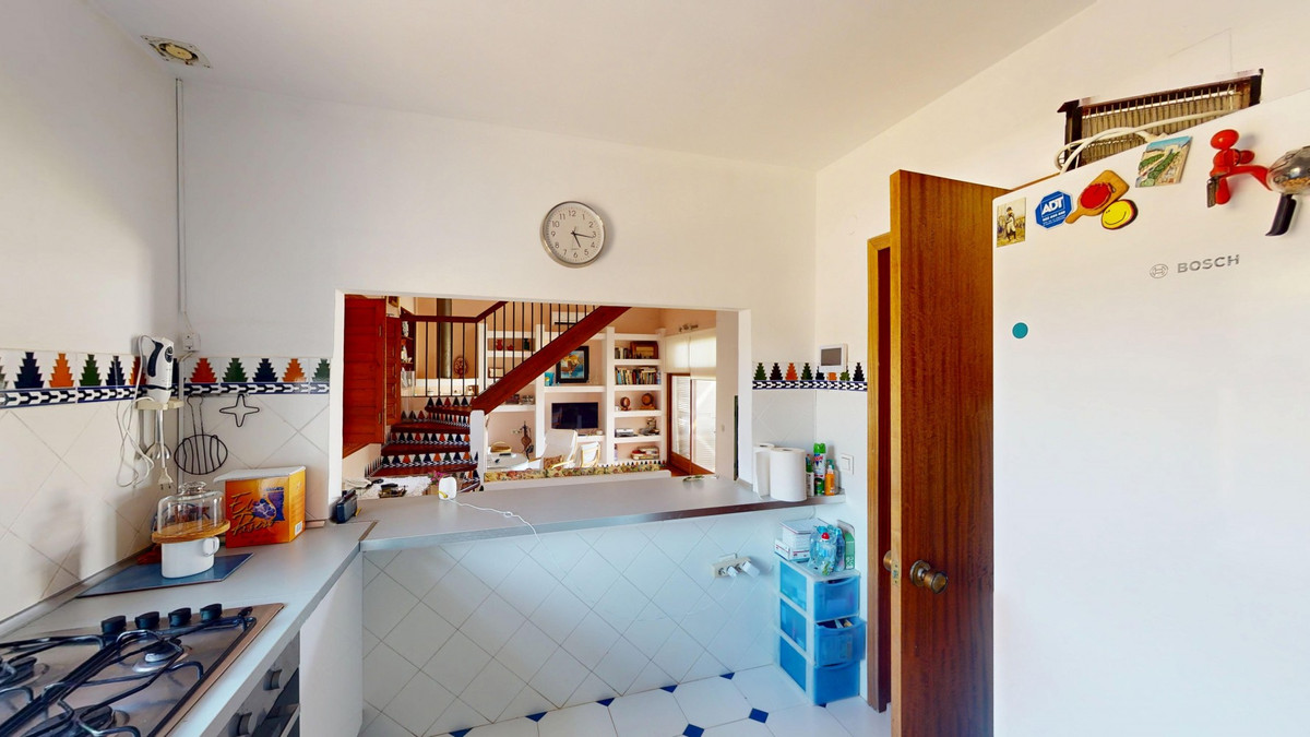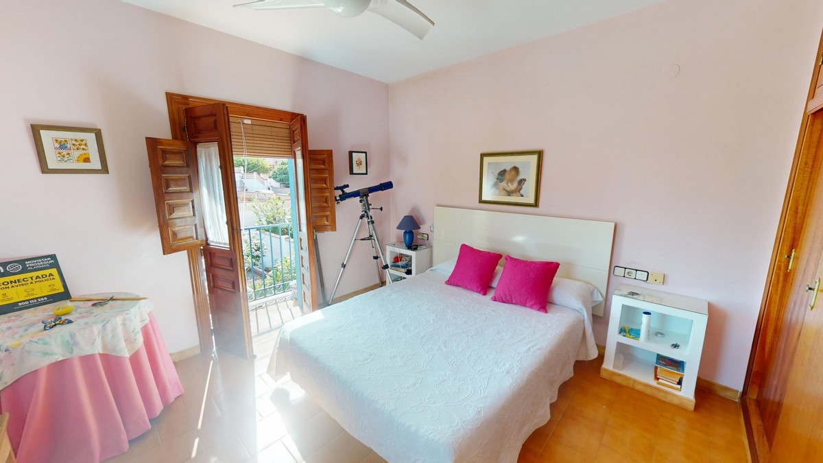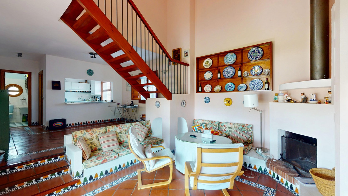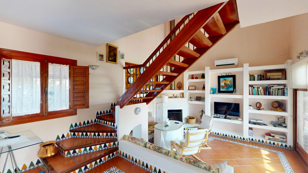This beautiful Spanish villa spans two floors and features three bedrooms, including an impressive primary suite, and two bathrooms, blending traditional Andalusian charm with modern comfort. The Mediterranean-inspired design is reflected in the terracotta tile floors, warm wooden accents, and bright, airy spaces. The living area boasts a unique split-level layout with decorative tile borders, a cozy fireplace, and built-in shelving. A stylish wooden staircase leads to the upper floor, while the open-plan kitchen connects seamlessly to the living areaperfect for family living or entertaining guests. The bedrooms are spacious and include built-in wardrobes for optimal storage. Large windows with traditional wooden shutters allow natural light to flood in and offer picturesque views of the surroundings. The bathrooms are full of character, one featuring a blue-and-white checkered floor with decorative tile borders. Outside, the villa offers a private garden with a pool, a chill-out area perfect for relaxing, a garage, and a rooftop terrace with stunning viewsideal for enjoying the Costa del Sols climate and scenery. Located in Chilches, this property is perfect as a permanent home, holiday retreat, or rental investment. We are pleased to be able to present this dream property to you soon, either personally or via virtual viewing. Because this world is unique - just like our Axarquía. In Andalusia. On the Costa del Sol. Here, on the sunny side of life...