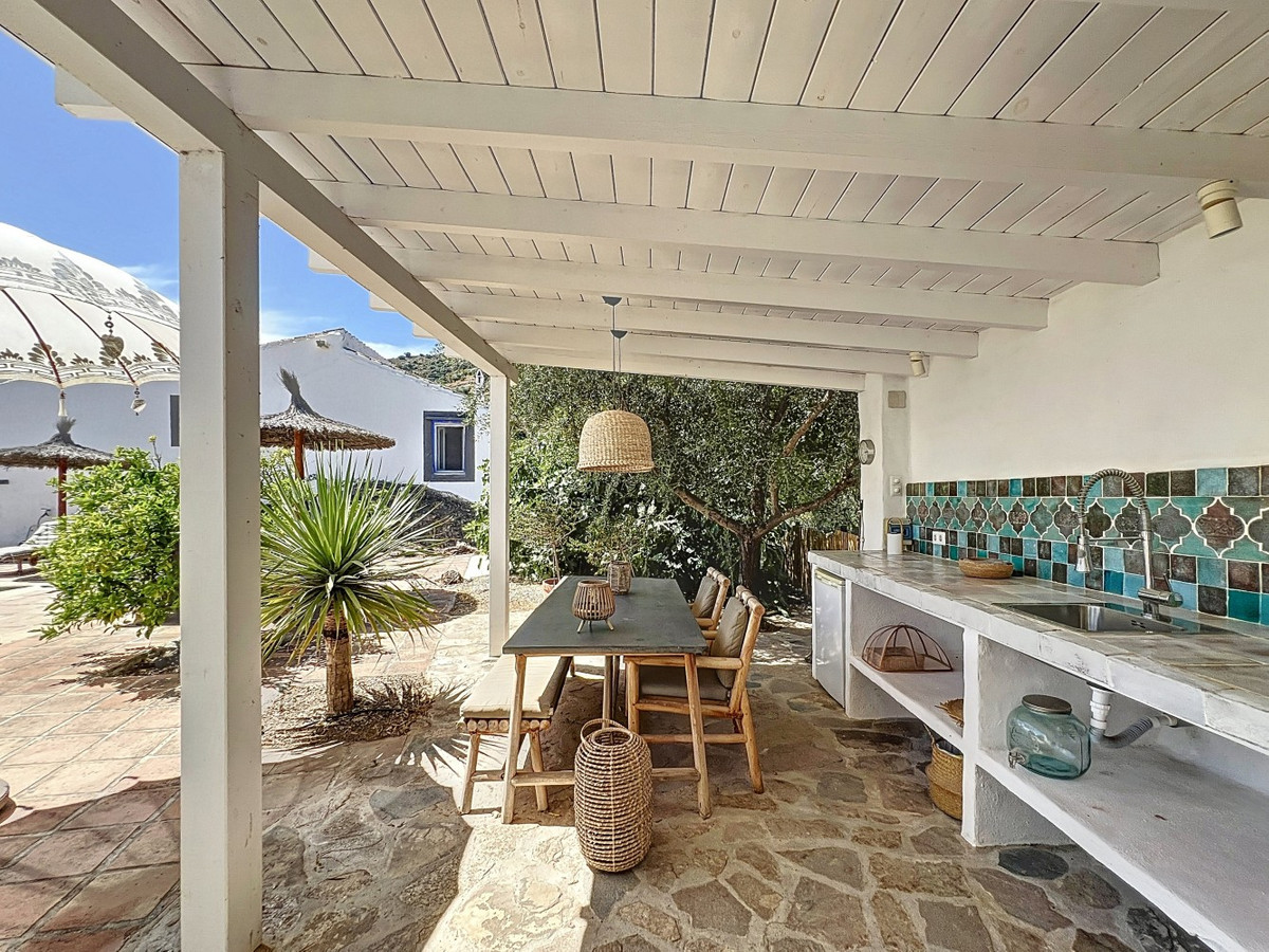 Nestled in the hills of Arenas, Málaga, this enchanting cortijo is more than just a home it's a Mediterranean haven full of character, peace, and possibility. Divided into three separate apartments, its perfectly suited for use as a charming B&B or a spacious family retreat, offering flexibility, comfort, and soul. The main apartment features two bedrooms and two stylish bathrooms, each with walk-in showers and carefully chosen details like marble vanities and patterned tiles. The open-plan living area exudes warmth, with terracotta floors, a soft grey sectional sofa, rattan accents, and a sparkling crystal chandelier. The kitchen is both beautiful and practical, with white cabinetry, colorful tiles, and modern appliances including a dishwasher and oven. The second apartment is a cozy, light-filled one-bedroom retreat. Though compact, it offers everything you need a small kitchenette, a chic bathroom with a tropical-leaf tiled shower, and elegant touches like chandeliers and decorative mirrors. Rattan, terracotta, and woven details bring warmth and texture to every corner. The third apartment offers a thoughtful layout with a bedroom, bathroom, office, kitchen, and living areas. Whitewashed walls, a fireplace, and large windows give it a bright, open feel, while red kitchen cabinets and rustic furnishings add a splash of personality. Every room is adorned with artistic elements, unique lighting, and handcrafted decor. But its the outdoor space that truly makes this property magical. The cortijo is surrounded by breathtaking mountain views, and the grounds are filled with charm natural stone flooring, shady terraces, tucked-away seating nooks, a daybed for lazy afternoons, and turquoise water shimmering in the pool. The covered outdoor kitchen is a highlight in itself, with handmade tiles and a handcrafted worktop that speaks to the care and love poured into every detail of this home. Every corner of this cortijo is full of character from artistic wall hangings and handmade lighting to the sense of calm that wraps around you the moment you arrive. Whether youre seeking a peaceful personal retreat or ready to welcome guests to a special B&B, this Andalusian gem is the perfect getaway. We are pleased to be able to present this dream property to you soon, either personally or via virtual viewing. Because this world is unique - just like our Axarquía. In Andalusia. On the Costa del Sol. Here, on the sunny side of life...