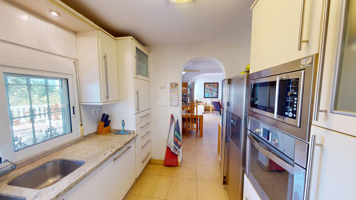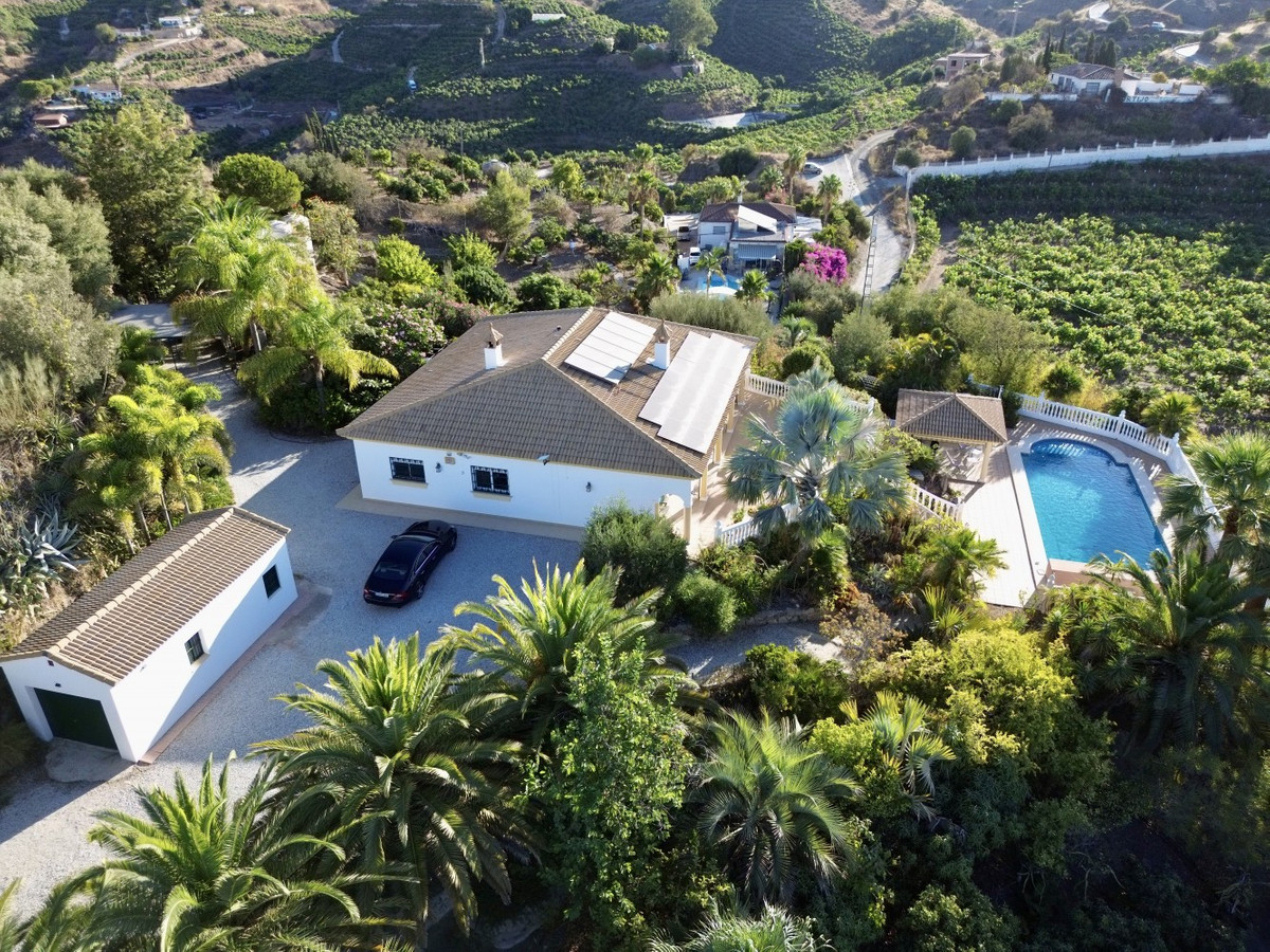 This charming villa in Vélez-Málaga combines comfort, spaciousness and a design that integrates tradition and modernity. The property has three bedrooms and two bathrooms, and an open-plan design that seamlessly connects the living room, dining room and kitchen, creating a bright and welcoming atmosphere. The living room has a cozy fireplace with a wooden mantel, perfect for cooler nights, and large windows that flood the house with natural light and offer views of the surroundings. The modern kitchen is equipped with stylish cabinets, granite countertops and stainless steel appliances, including gas hob and extractor hood. The villa has an office space and a decoration that combines contemporary and traditional elements, with artistic details that add colour and personality to the rooms. Outside, the property stands out for its large plot full of various fruit trees, including exotic fruits, as well as a small greenhouse and a storage room. The house has a carport, private pool with underwater speakers and counter-current swimming system, chill out area and on the terrace a barbecue area, perfect for enjoying outdoor meals while contemplating spectacular views of the sea and the mountains. This villa represents a unique opportunity for those looking for a home with charm, comfort and ample amenities in the beautiful region of Malaga. We are delighted to be able to present this property to you soon, either personally or via virtual viewing. Because this world is unique - like our Axarquía. In Andalusia. On the Costa del Sol. Here, on the sunny side of life...