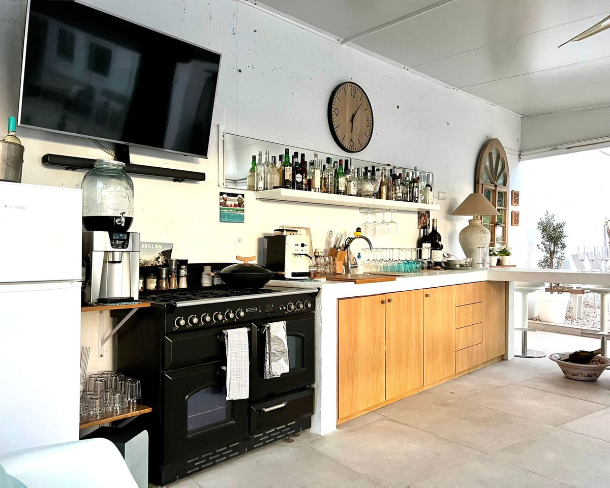 Huge covered pergola with fully equipped outdoor kitchen and glass curtains, creating a magical year-round entertainment terrace protected from wind and cooler evenings.