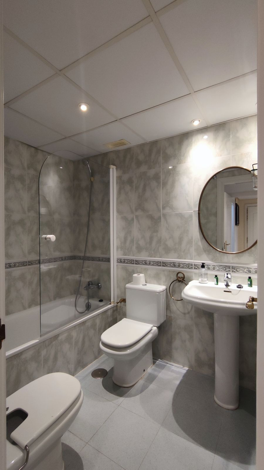 The apartment is part of a quiet and very well-maintained community with tall subtropical trees and plants, Andalusian-style fountains, a large swimming pool with access to showers and toilets, and even a paddle tennis court.