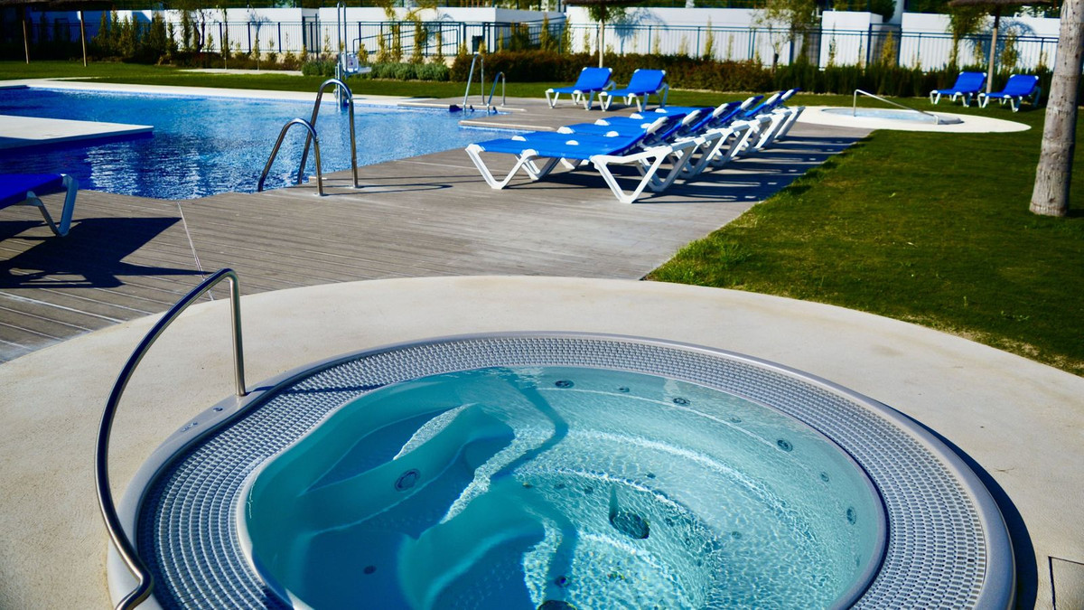 The garden connects directly to the tranquil communal areas featuring beautifully landscaped Mediterranean gardens, swimming pools, jacuzzis, and a children’s play area.