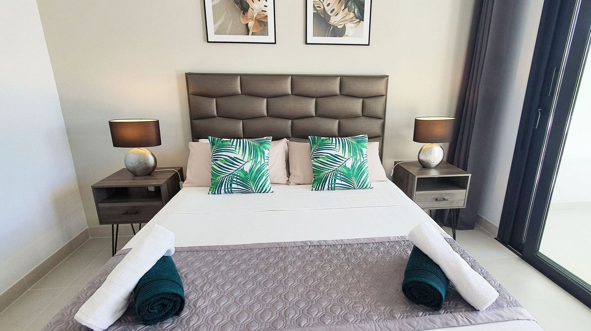 The bright open-plan living and dining area flows naturally to the west-facing terrace and private garden, creating a seamless connection between indoor comfort and outdoor leisure. Floor-to-ceiling windows fill the space with natural light and frame beautiful views to the communal gardens and swimming pools. Premium specifications include underfloor heating throughout, central A/C, an advanced heat pump system, ultra-fast fiber internet, and tasteful furnishings that exude modern sophistication.