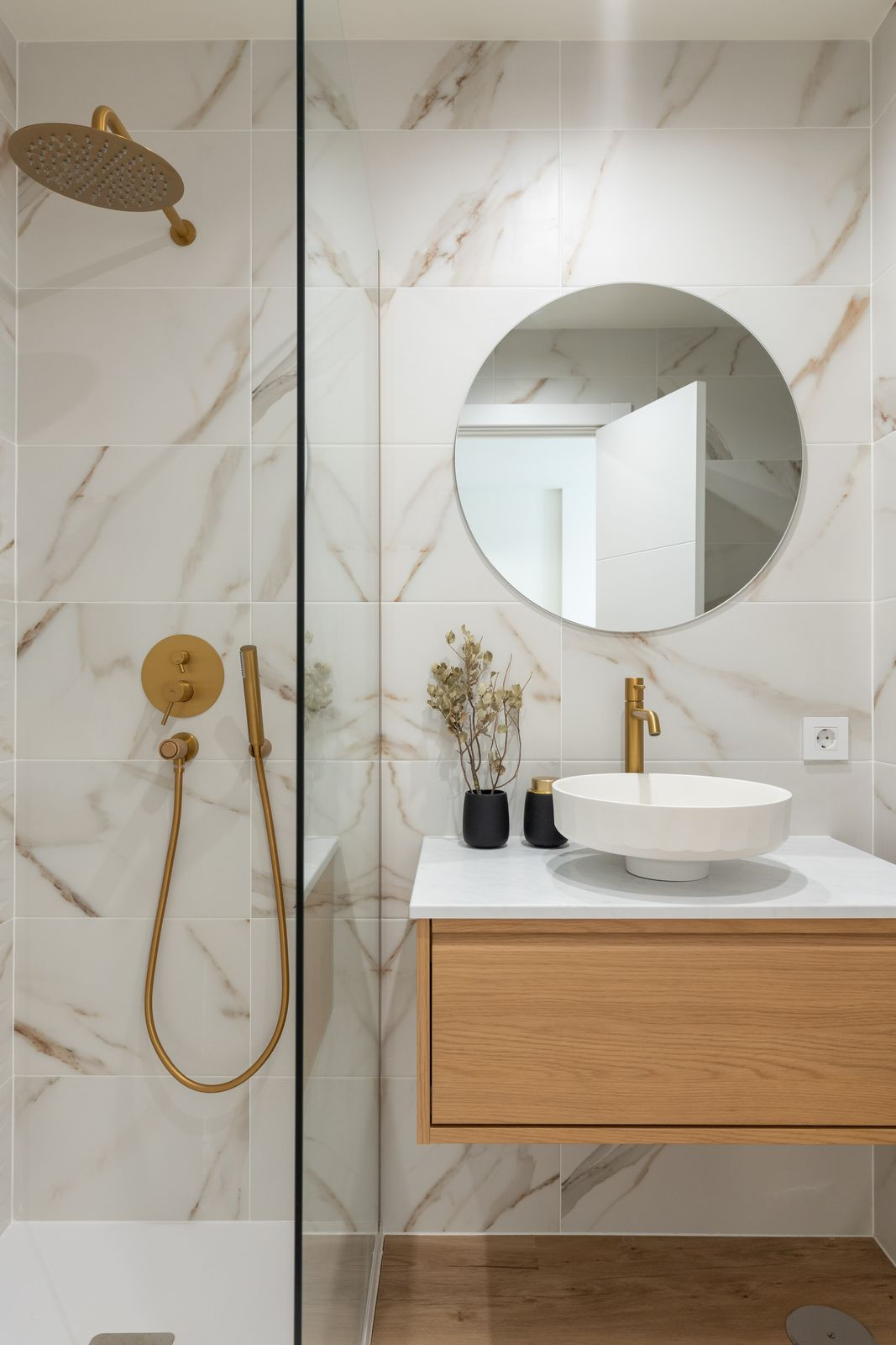 As you step inside, you are greeted by a bright, open-plan living area where style and functionality flow seamlessly. The kitchen is equipped with elegant natural Calacatta marble worktops and contemporary fittings, perfectly complementing the stylish shower room and high-quality finishes throughout the home. Air conditioning in the living area and main bedroom ensures year-round comfort, while a ceiling fan in the second bedroom adds gentle natural ventilation.