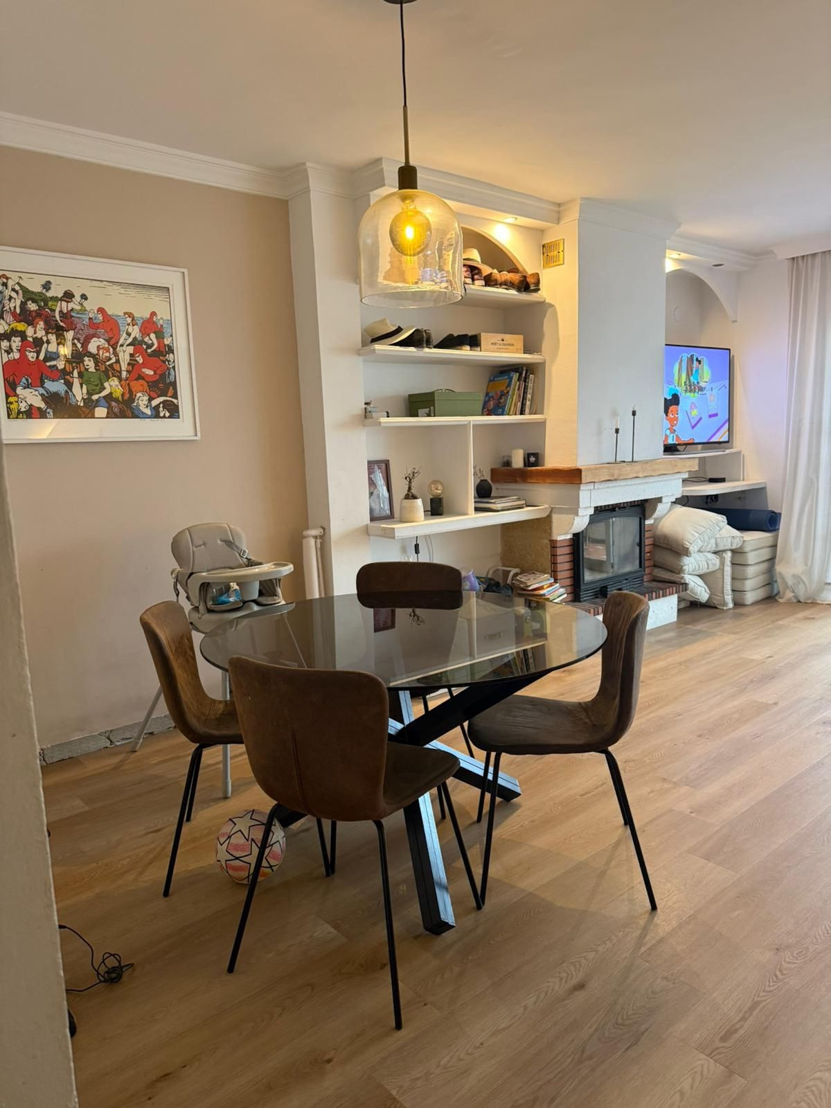 Main floor: Bright, very spacious living-dining room with fireplace, opening onto a magnificent terrace-porch and the communal garden with swimming pool, ideal for keeping an eye on the little ones. Kitchen and guest toilet on the same floor.