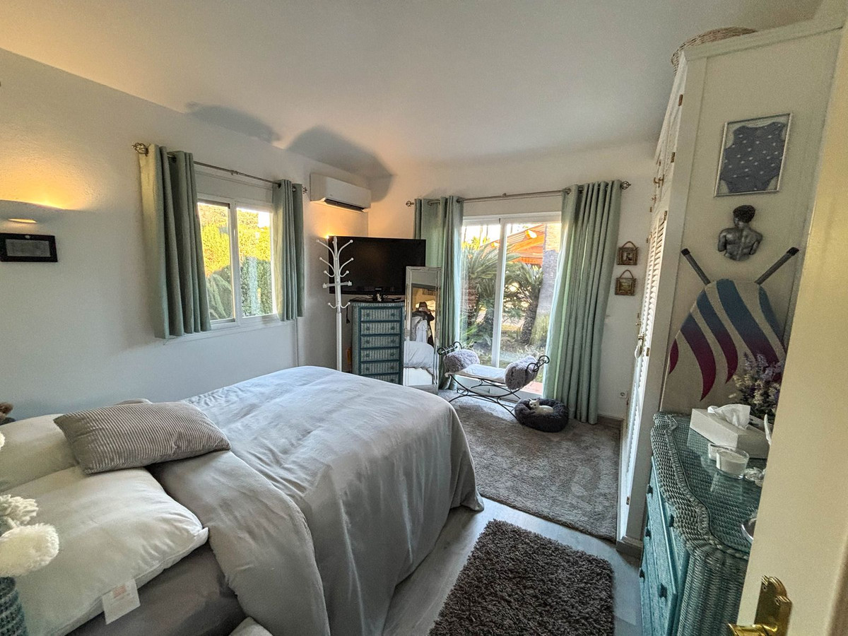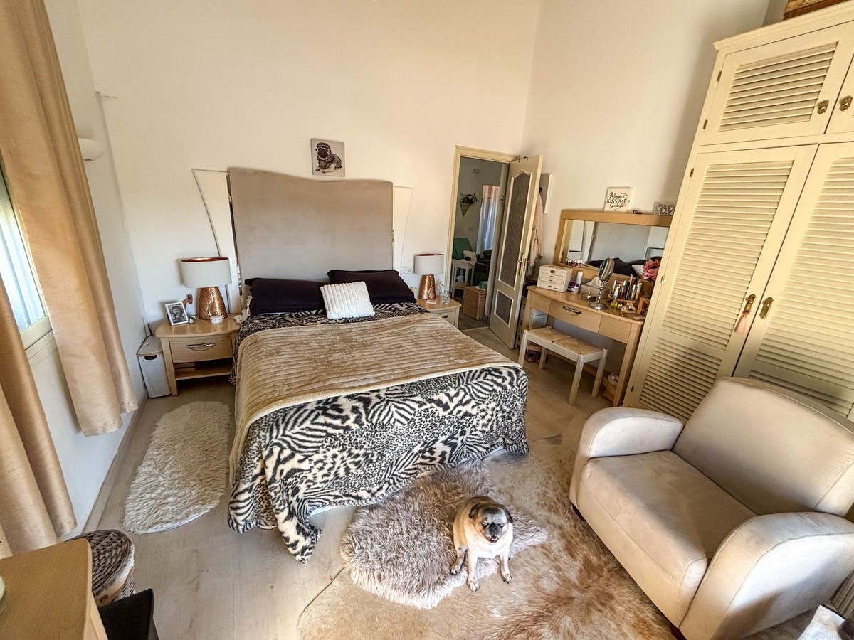 The house is built on one level, providing comfort and practicality throughout. The entrance hall leads to a large living room with high ceilings, bright and inviting, with direct access to a covered terrace overlooking the garden and swimming pool. Adjacent to the living room is a spacious, fully equipped kitchen, ideal for everyday living.