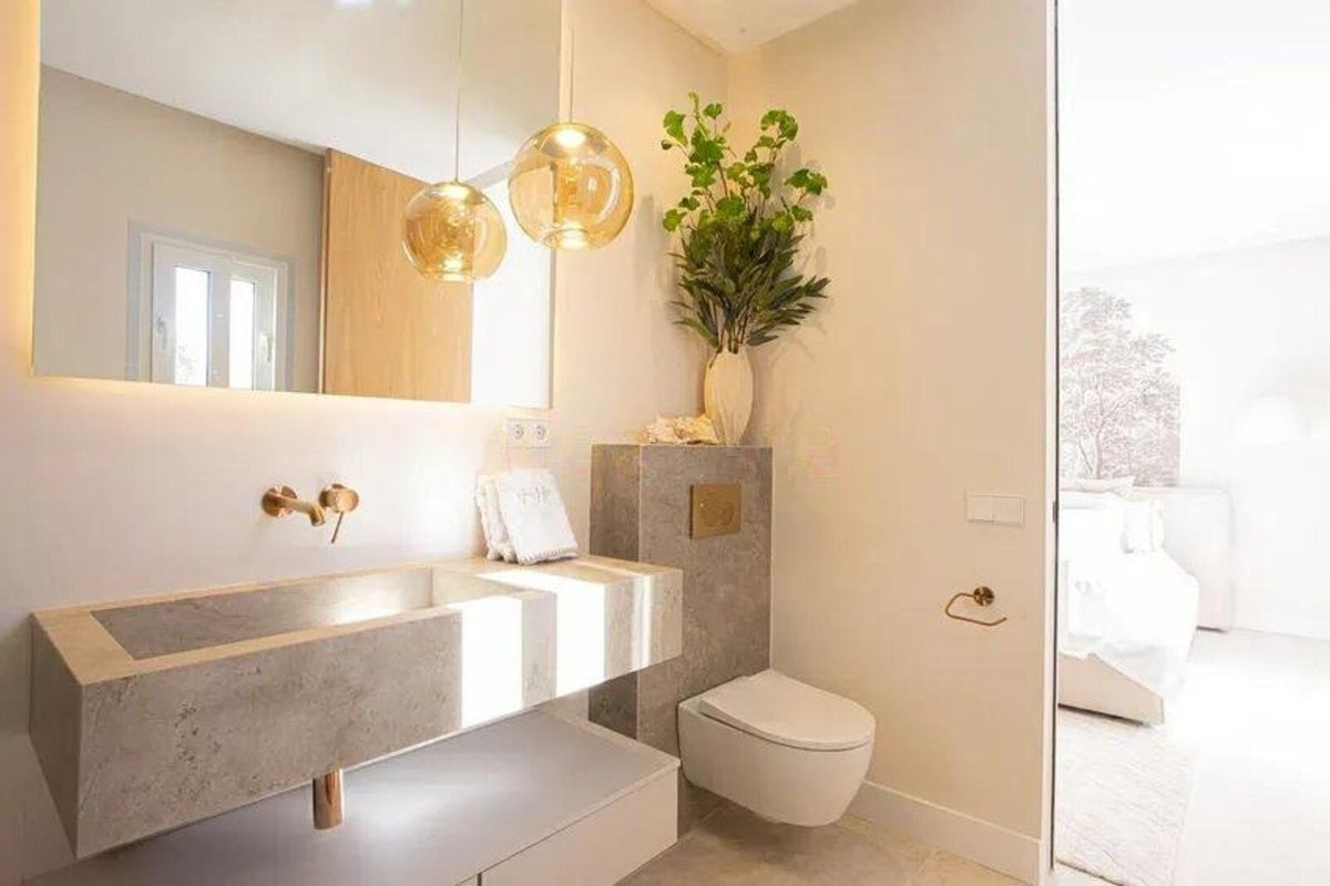 The property is distributed over two levels plus a solarium. On the entrance floor, the interior spaces flow naturally towards the outside thanks to a spacious open-plan living-dining room with direct access to a generous terrace, perfect for enjoying the Mediterranean climate or for social gatherings. On this level there is also a contemporary kitchen, a guest toilet and a bedroom, providing functionality and comfort for everyday living.