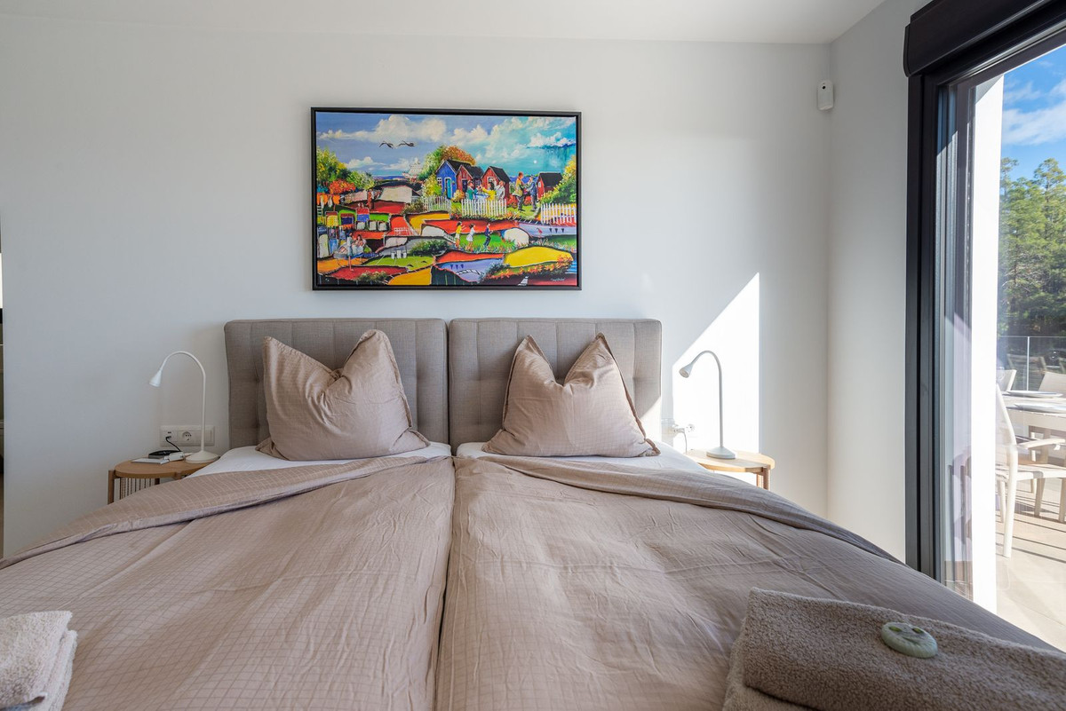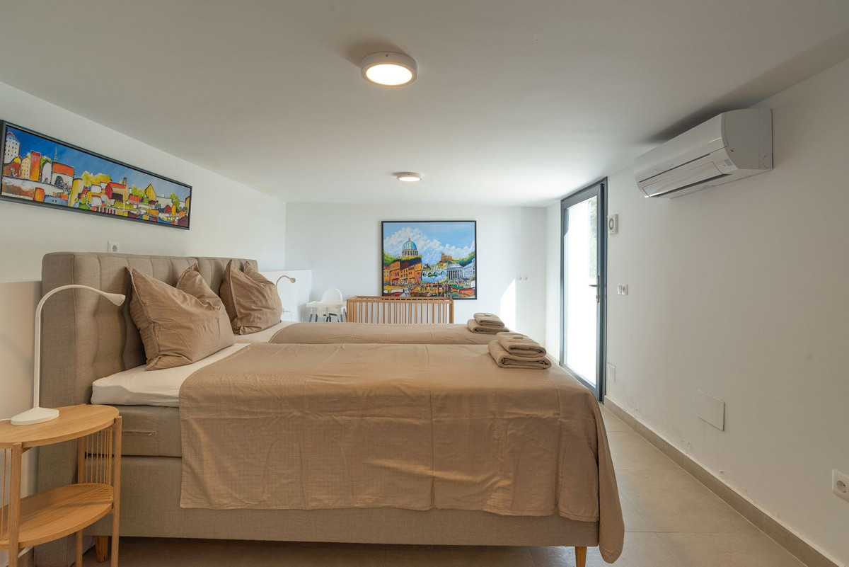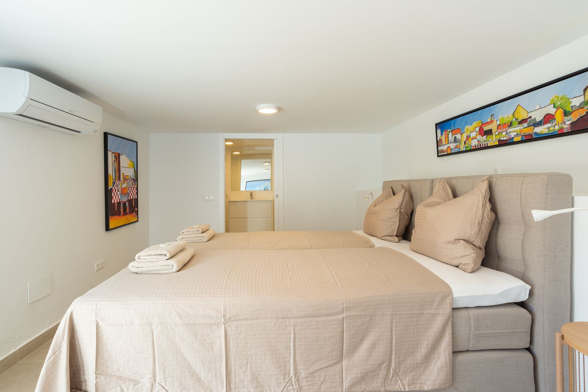 There are 2 bedrooms on this floor, both with access to the terrace/pool. 2 bathrooms both with shower and one also has a bathtub.