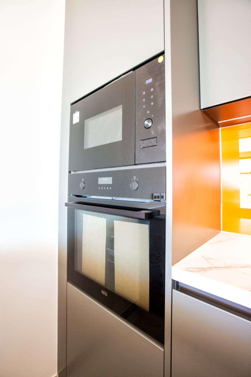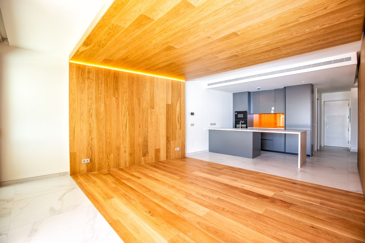 The home offers two spacious bedrooms and two elegant bathrooms, along with a bright living room and kitchen arranged in an open-plan layout. The décor follows a modern and minimalist style, creating an atmosphere of sophistication, simplicity, and comfort.