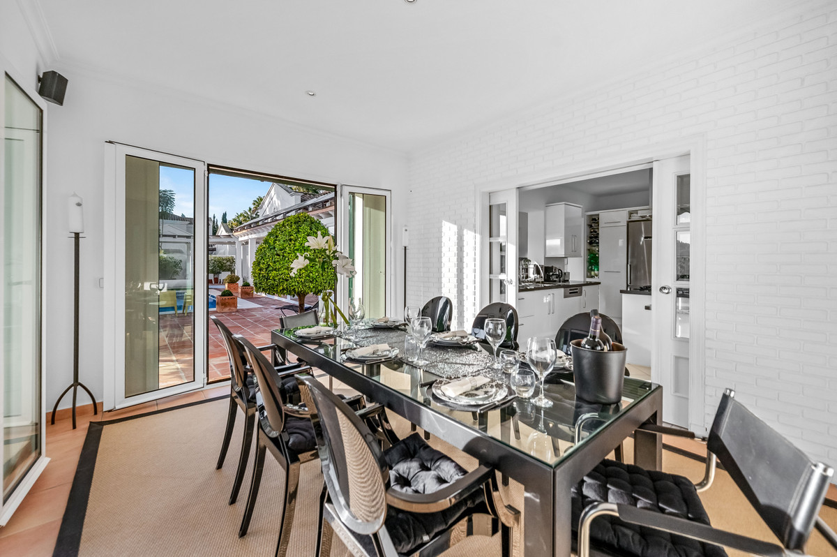 Returning to the ground floor, the home continues into the dedicated dining room, which connects seamlessly with the kitchen. The kitchen opens into a separate breakfast room, surrounded by windows and offering garden and pool views, ensuring abundant natural light throughout the day.