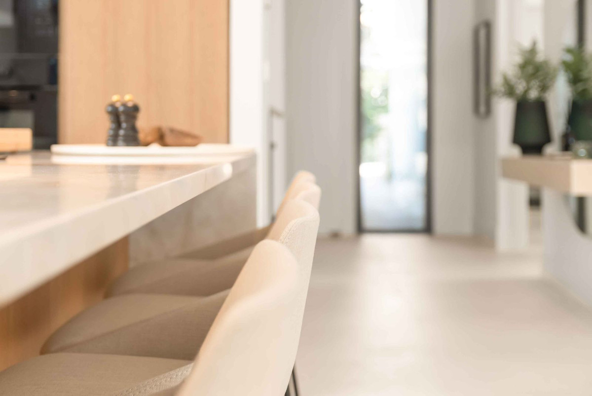 The main living area is arranged as an open-plan environment, where the lounge, dining space and fully fitted kitchen are visually and functionally connected. Large sliding doors extend the interior towards the terrace, reinforcing the relationship between indoor and outdoor areas. The kitchen is designed with integrated appliances and a central island, supporting both everyday use and hosting. Subtle ceiling detailing and material continuity contribute to a calm and cohesive spatial flow.