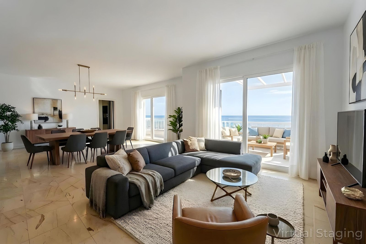 The entrance hall, reflecting classic Andalusian design, opens into the main living room — a bright and inviting space that connects directly to a large terrace. Here, you can imagine enjoying family breakfasts while admiring the spectacular sea views. Featuring marble floors, a fireplace, and air conditioning, this living area becomes the heart of the home and the perfect setting for unforgettable moments.