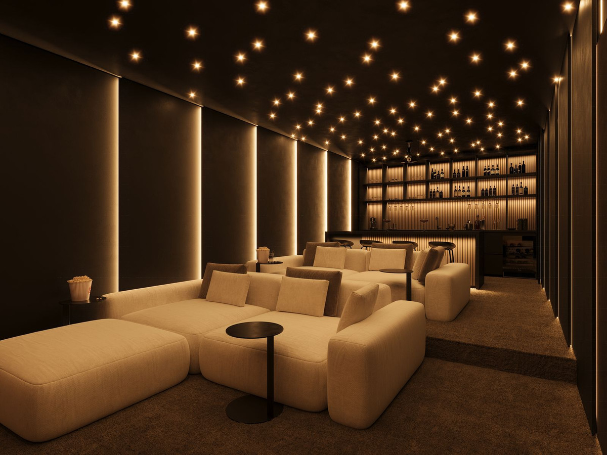 Solarium with jacuzzi, bar, and chill-out area designed for entertainment. At the rear, a dedicated yoga deck for relaxation and a private golf practice area.