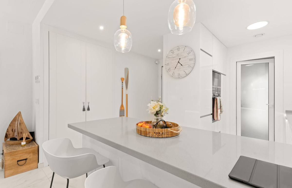 The property features a modern and functional open-plan layout, combining kitchen and living area. The fully equipped kitchen has direct access to an east-facing terrace, perfect for enjoying sunny mornings.