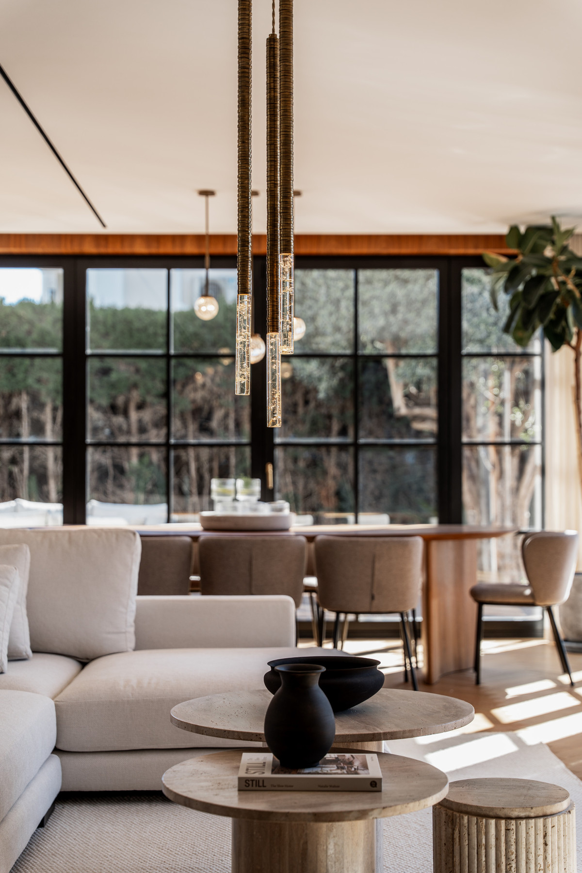 Upstairs, the principal suite benefits from vaulted timber ceilings, open dressing, sculptural stone basins and a walk-in marble shower. Full-height glazing frames the views to the golf and sea, while maintaining privacy. The additional bedrooms follow the same standard of finish and proportion, each thoughtfully designed to maximise comfort. Practical elements, such as a separate utility room, integrated wine storage, custom carpentry and layered lighting, are integrated discreetly throughout.