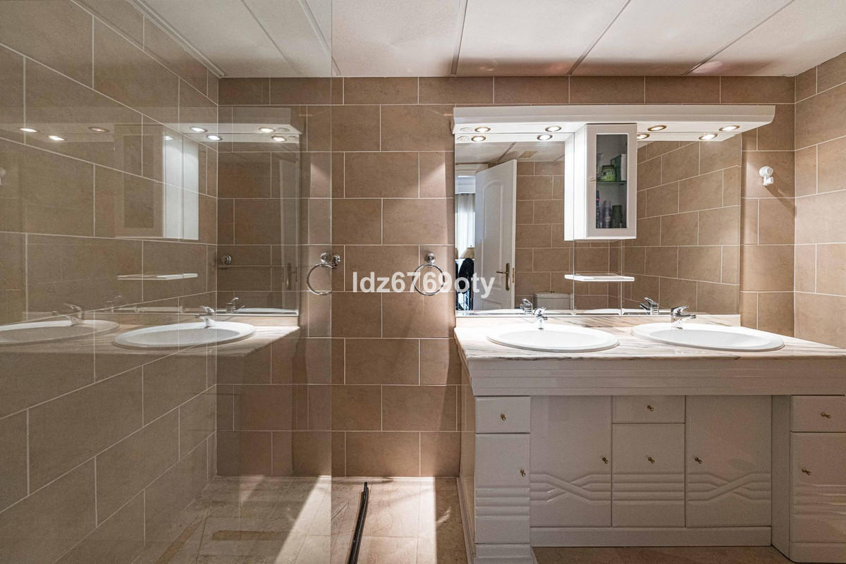 A spacious and very well-maintained luxury apartment in a prime location next to the popular Torrequebrada Golf Course in Benalmádena Costa! This spacious and light-filled corner apartment is situated in the beautifully maintained small-scale ‘Palmeras del Golf’ urbanisation, featuring numerous palm trees and gardens and boasting two swimming pools. The 3-bedroom apartment features a large master bedroom with an en-suite bathroom with double sinks and built-in cupboards, a bath and a toilet. The other two spacious bedrooms share a second bathroom, which also features double sinks and built-in cupboards, a large walk-in shower and a toilet. All bedrooms are fitted with spacious built-in wardrobes and air conditioning units for both cooling and heating.