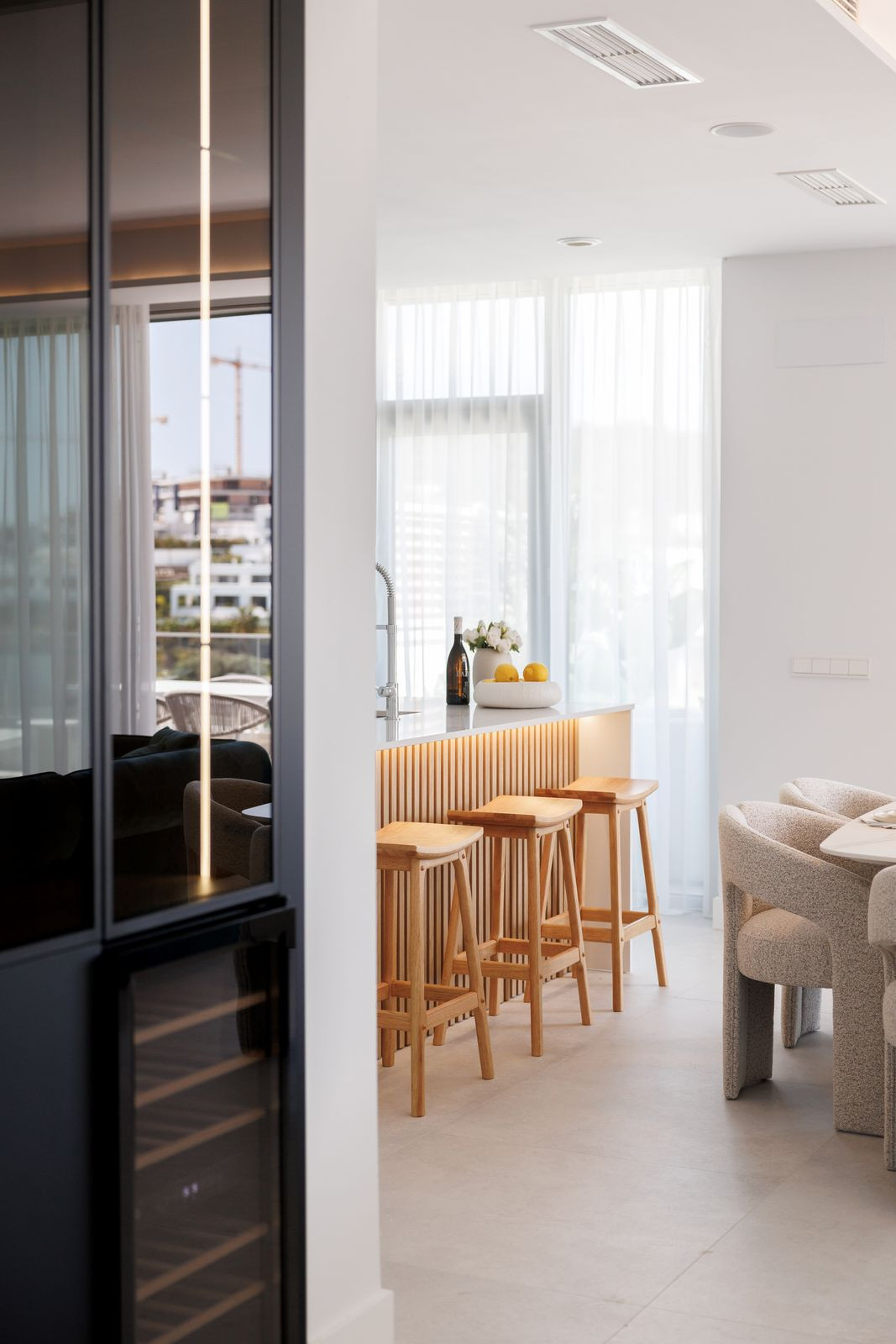 The true highlight of this penthouse is the impressive 128 m² of terraces, designed for both relaxation and entertaining, featuring a private swimming pool, stylish lounge areas, a covered outdoor dining space, and open views over landscaped gardens and modern architecture. The east-facing orientation allows for soft morning light and pleasant temperatures throughout the day, making the outdoor areas enjoyable year-round.