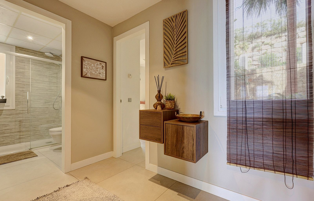 La chambre principale dispose d'une salle de bains privative et d'un accès direct à la terrasse, tandis que les autres chambres spacieuses sont équipées de placards intégrés. L'ensemble de la propriété bénéficie de finitions haut de gamme, notamment un carrelage en céramique, la climatisation réversible, le chauffage au sol, un système de détection de fumée et un système d'alarme intégré.