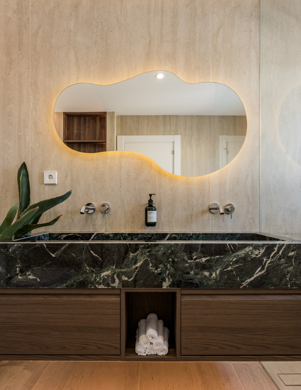 La cuisine est dotée de plans de travail en marbre italien raffiné et comprend un bar à vin sur mesure. Une chambre d'amis avec salle de bains privative et terrasse privée complète cet étage, offrant confort et intimité aux visiteurs.