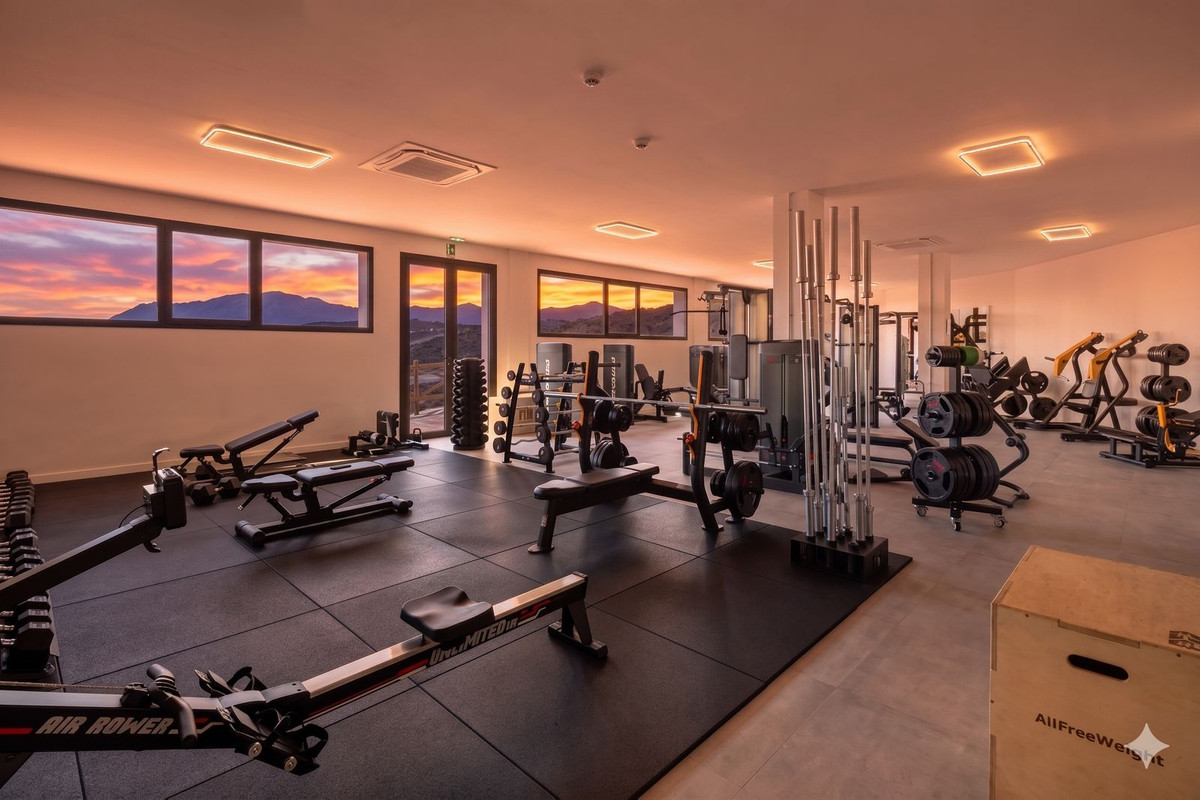 Salle de sport et espace bien-être entièrement équipés avec piscine intérieure